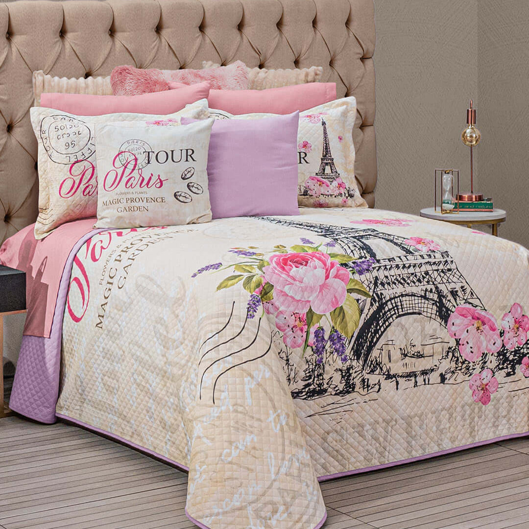The coordinated Paris magic Bedspread is a complete set that includes Shams, cushions and a set of sheets. It is so cute, its design alluding to Paris makes it ideal for a romantic and feminine room.